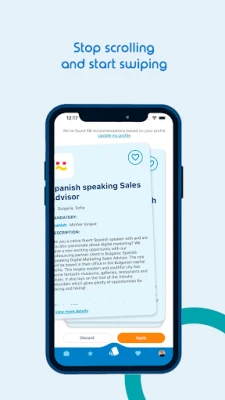 Oh heeey! I see you! Are you a job seeker looking to fire up your career status? Swiping left or right is safer with us - no heartbreaks involved, but if it's a match, you will gain way more than butterflies in your stomach. Our free job app allows you to try new destinations, use your language skills, and discover that there are plenty of fish in the sea. Yep, we're talking about job listings, tailored to your candidate’s profile and your career goals. Are you ready to enjoy this personal & professional experience?