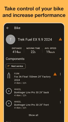 ✔️ Receive timely notifications for component maintenance or replacement. For example, when your MTB suspension fork hits 120 hours of use, your road bike waxed chain clocks 400 km, or your gravel tires reach 5000 km.