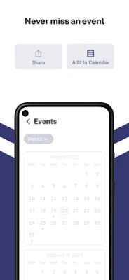 NEVER MISS AN EVENT The event section shows a list of events throughout the district. Users can add an event to your calendar to share the event with friends and family with one tap.